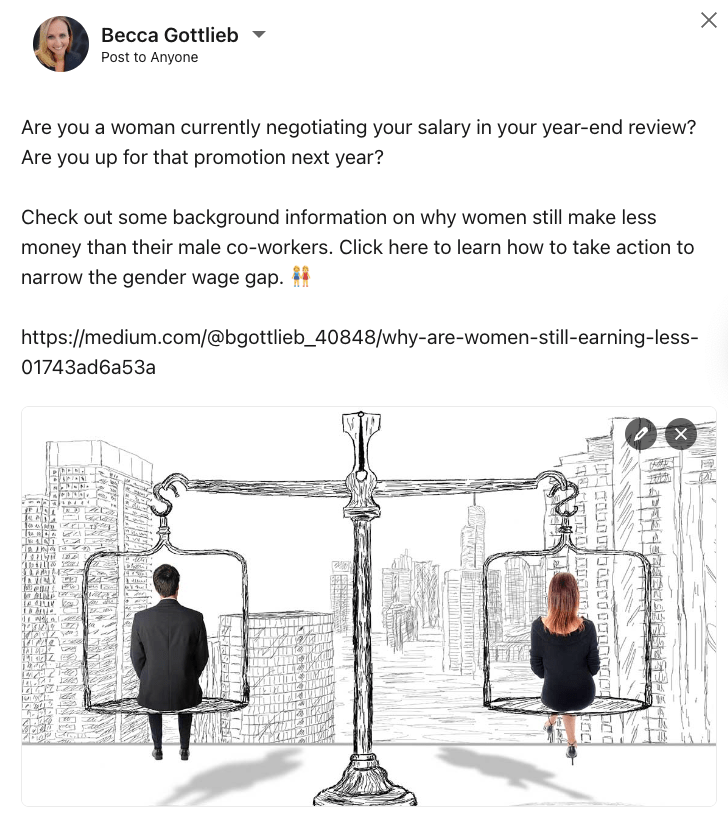 The audience on LinkedIn is usually looking for jobs, looking to network, and for career advice. This was a great place to gather an audience of men and women to increase awareness of the challenges women face in negotiating their salaries and earning promotions.