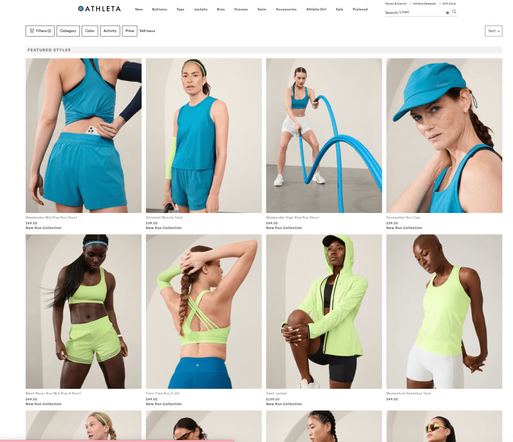 If you are still staring at a blank sheet of paper or digital art board like myself, a great place to start is selecting what type of grid will work best for the project. Caldwell points out, “By establishing rhythm and pace, the grid helps the audience find the same type of information over a number of pages and also means that you can work faster and more efficiently” (Caldwell, 158). Determining whether multiple columns, a single column, or a modular grid is right for your design will take a few attempts using trial and error. A very literal example of how a grid can be used on a website is Athleta’s website with all of the items lined up in columns of four.