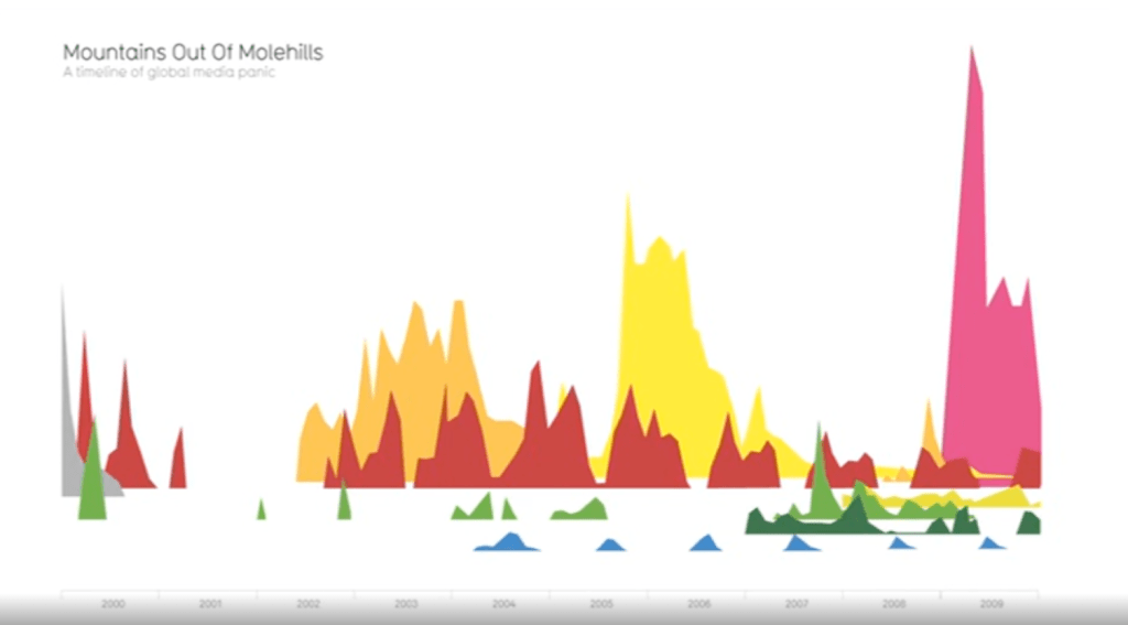 For example, David McCandless in “The beauty of data visualization” points out specific patterns that can be observed through data visualizations. In the below graph of global media panic from different irrational fears, he points out the gap in 2001 due to 9/11 can be easily observed. He also points out that the violent video gaes fear has a twin peaks pattern. This is due to copy-cat shootings or anniversaries of the actual events that cause a second surge. Both are patterns that were observed strictly from the visual patterns that would have been otherwise missed in a data spreadsheet.