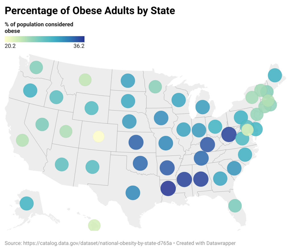 However, a symbol map can also be used to show data by using the size of symbols to represent data with geometric shapes. The example below does not illustrate the amount of obesity percentages very clearly because the data is so close. You can see that Colorado has a smaller dot than Louisiana, but the size does not show a drastic enough contrast for the eye to easily see. A solution would be to make the data in a smaller or larger proportion so that it looks more contrasting on a symbol map. However, the reader will mostly look at the shade of color instead of the symbol size here. For instance, this map is meant to show contrast between states and it looks like the size of most symbols is the same, which can be an example of how this map would be misleading.