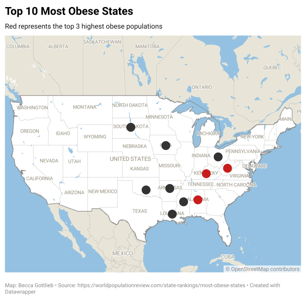 This map is helpful in seeing a handful of locations and highlighting them to analyze the relationship and similarities between them and the surrounding states. You can infer from the visualization that the highest concentration of obese populations are in the middle of the country away from coasts, bodies of water, and any mountainous regions. With the red highlights of the top three most obese states, you can compare the relationship of the southern states that have the highest obesity rates in the country. West Virginia, Kentucky, and Alabama are all relatively close to each other geographically and you can further analyze the similarities of these similar states incuding their similar physical regions, food consumption traits, and cultural habits.