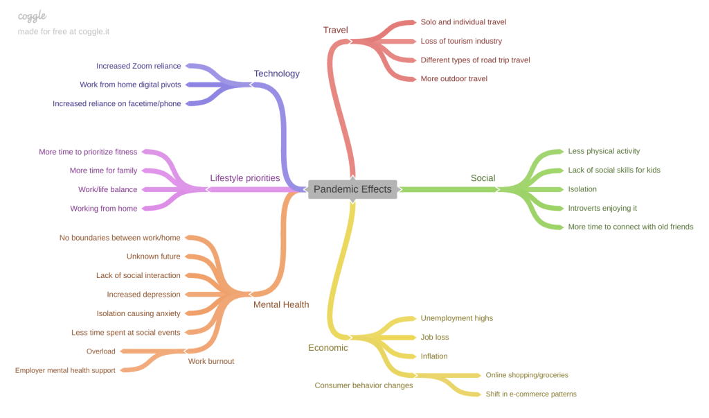 After brainstorming for a podcast idea using the mindmap below, I decided to go with the branch with the most ideas. I created a mindmap on how the pandemic affected our society from our economy, to our travel, technology, and how it has affected mental health. I found that I had the most inspiration towards the changes the pandemic has brought to mental health.